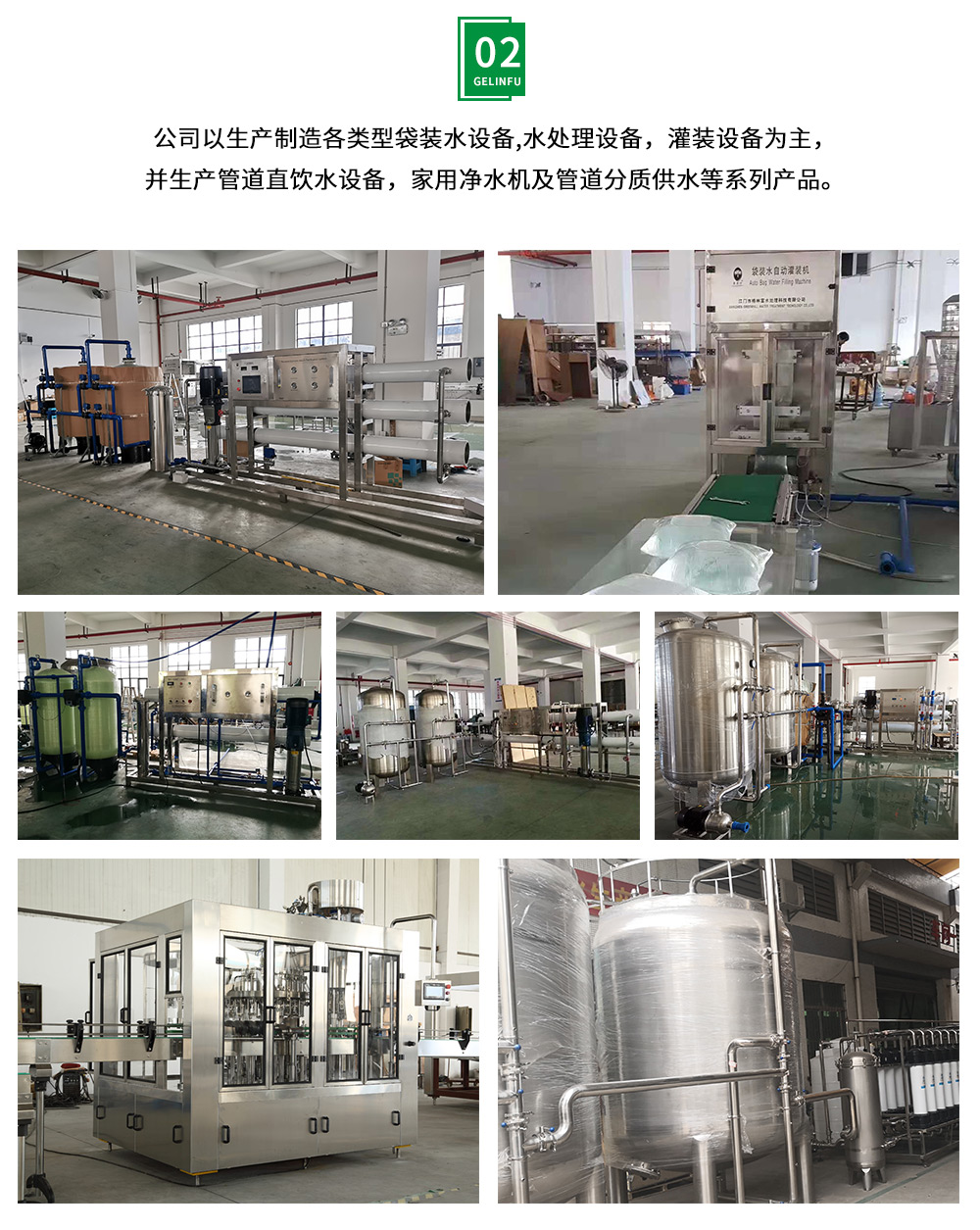 江门市格林富水处理科技有限公司经过多年的发展已成为颇具实力的企业团体。公司以生产制造各类型袋装水设备,水处理设备,灌装设备为主,并生产管道直饮水设备,家用净水机及管道分质供水等系列产品,是国内净水屋(水站)设备制造企业之一(主要产品包括袋装水设备和综合性饮料包装、3/5加仑自动灌装设备、,以及净水屋相关设备)。
